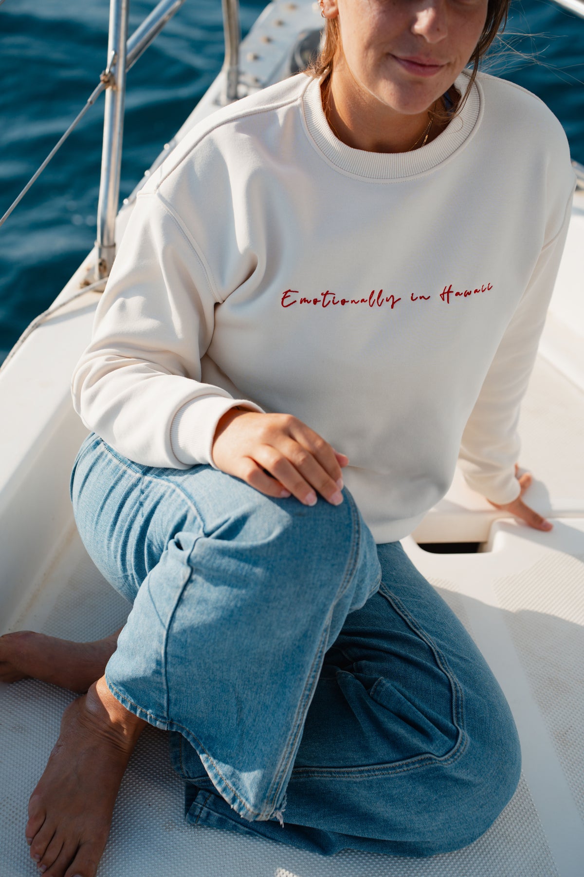 אישה על יאכטה לובשת סוויטשירט לבן עם טקסט – מראה שמשדר קלילות, חופש וסטייל ייחודי, בדיוק כמו כל פריט ב-Lika Swimwear שמלווה אותך ברגעים המיוחדים שלך על המים והחוף.